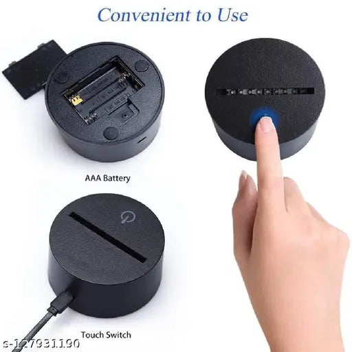 The 3D Illusion LED Night Lamp is a combination of art and technology that creates an optical 3D illusion and plays tricks on the eyes. You will see the design, but as you get up close, you see a thin acrylic glass sheet that's completely flat. It's bound to dazzle and impress your guests while always lighting up the room and your lives. This playful product combines manmade fibers with natural materials and is produced using both machines and artisan handwork. Perfect for displaying in your bedroom, living room, office, as a night lamp, or any way you want to use it. On-off : Touch the power on long-press with three seconds to power off. Product efficacy: 2.5W Product voltage: 5.0V Product weight: 300 gm. Lamp base: 95mm Diameter X 42mm high Acrylic: 4mm thickness. Size of package box: 22cm X 15cm X 4cm. Package Includes: 1x Acrylic plate, 1x ABS lamp base, 1x USB cable, 1x adapter.Press the touch button to the last color, then press it again, auto color changing mode works. Advantage: Wear-resisting, no fade, Energy saving. Power spend: 0.012kw.h/24 hours; LED life span: 10000 hours It can be put in bedroom, child room, living room, bar, shop, cafe, restaurant, etc as decorative light. Notice: Battery power is supported. Night lamp || Night light || Color changing lights || Decorating lights || LED lights